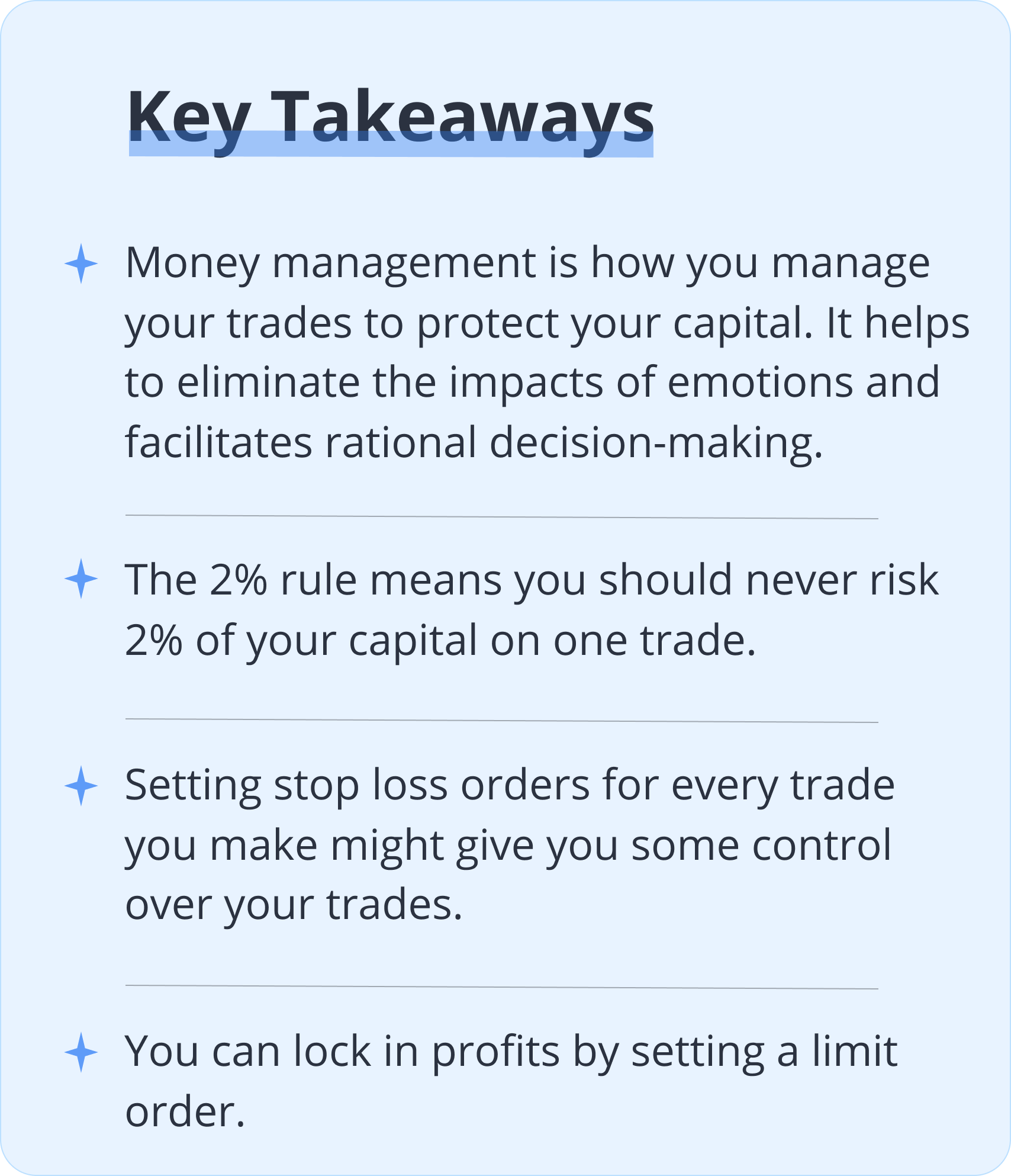 In stock trading, money management is how you manage your trades to protect your capital.