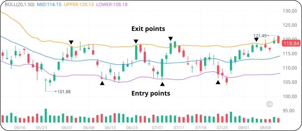 The stock/ETF is overpriced when it’s in the upper band and it is underpriced when it’s in the lower band. Swing traders may choose to buy when the price drops below the lower band and sell when the price rises to break through the upper band. This strategy is typically more effective when the price is moving in a range, as shown below.