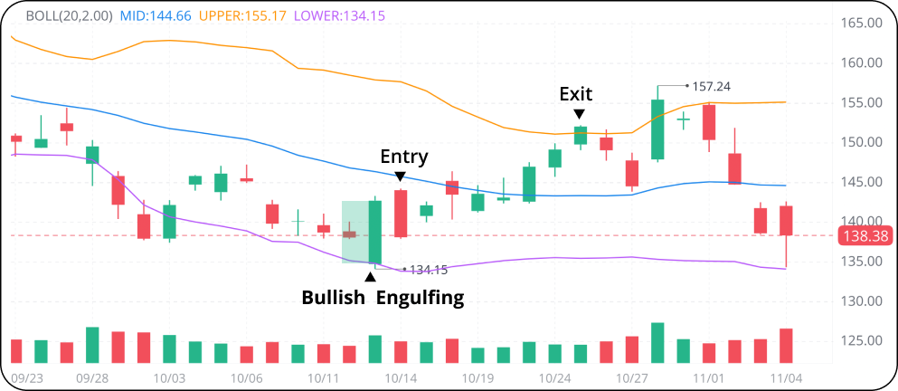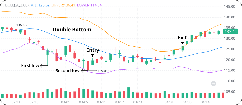Swing traders may enter a long position following the second low and close the position when the price breaks through the upper band. They may also wait for the price to fall back to the middle band before making an exit.