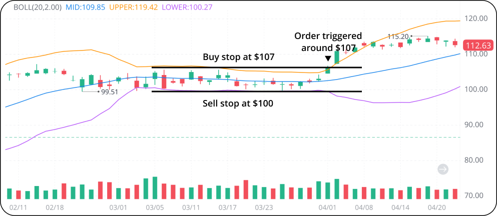 They can enter a buy stop order above the upper band or sell stop order below the lower band to monitor the market.