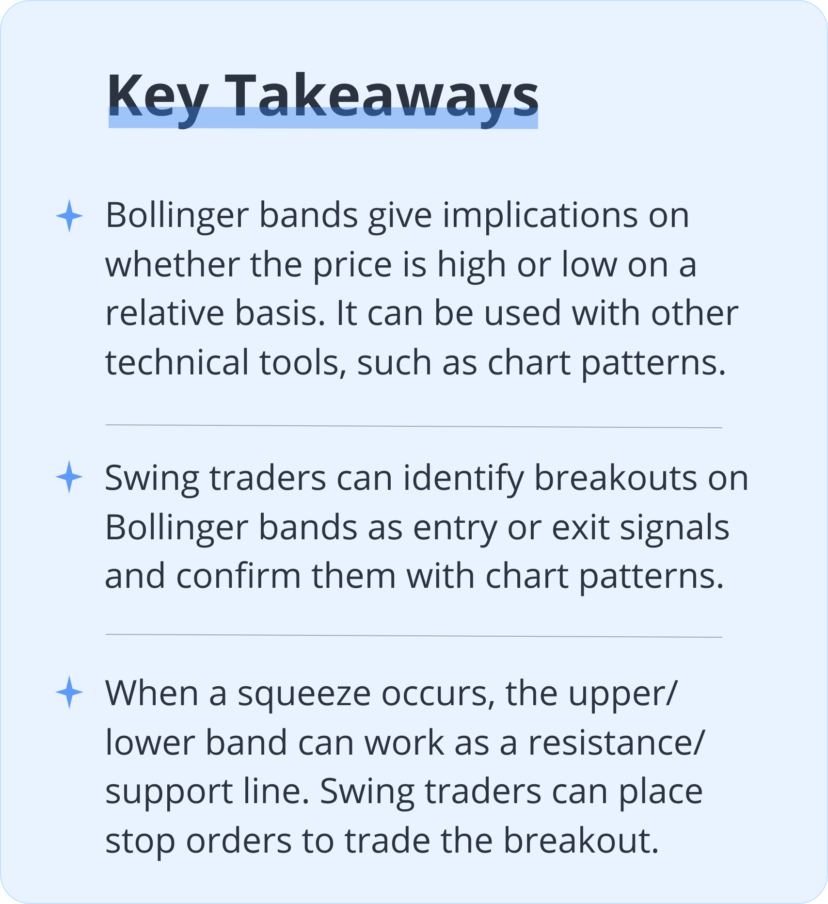 Swing traders can identify entry or exit points quickly by using Bollinger bands. However, it can be risky if used as a standalone indicator. Swing traders should use Bollinger bands together with other technical tools, such as chart patterns or MACD.