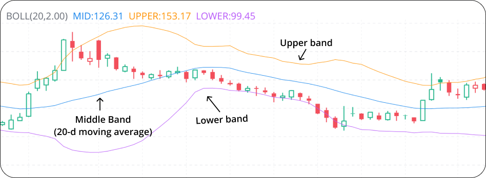 Bollinger bands consist of a middle band with two outer bands.The middle band is a simple moving average, usually a 20-d moving average, while the lower and upper bands are the 2 standard deviations.
