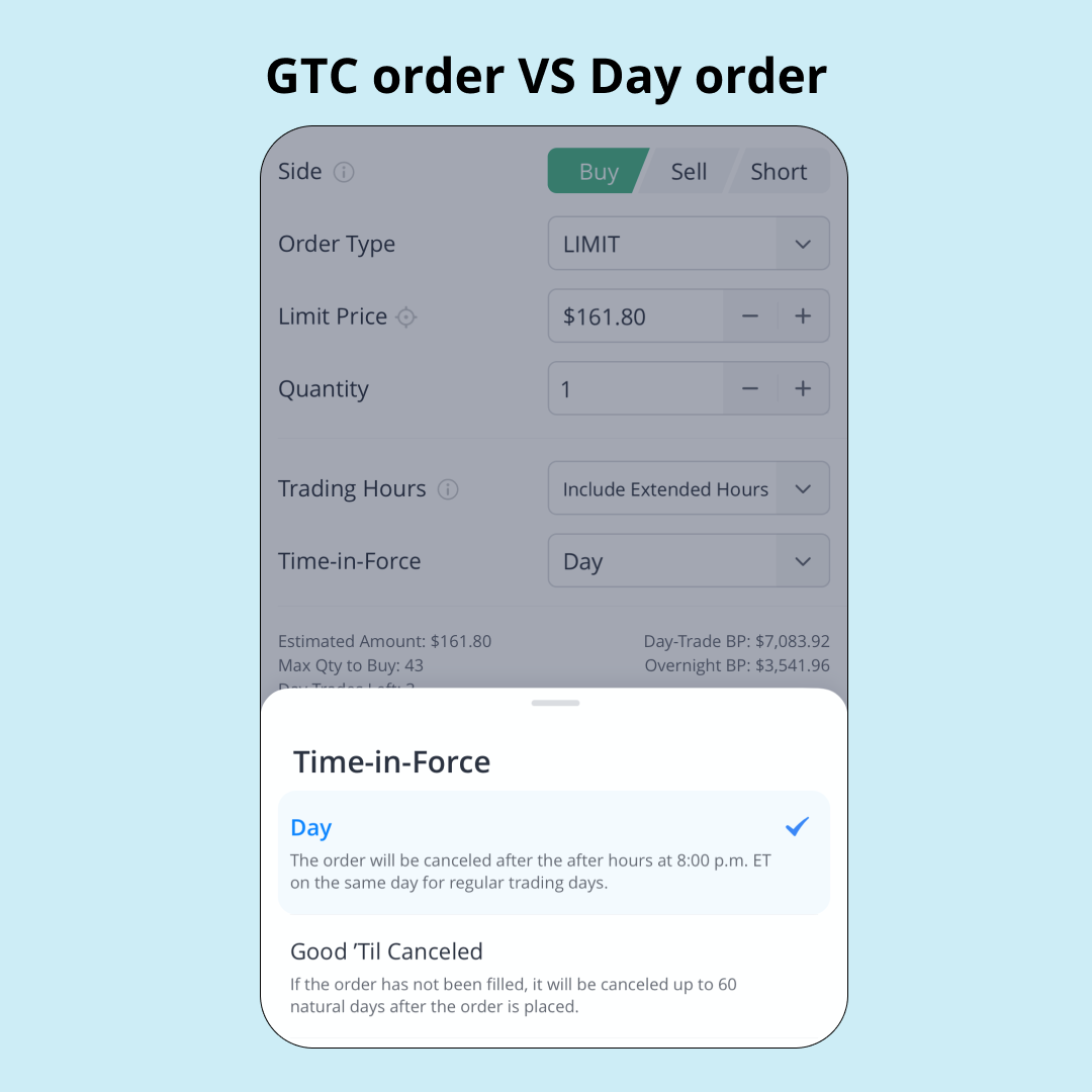 When you're placing an order, you have to choose a Time-in-Force—day or Good ‘Til Canceled (GTC). Let's figure out how to place them and what the differences are.