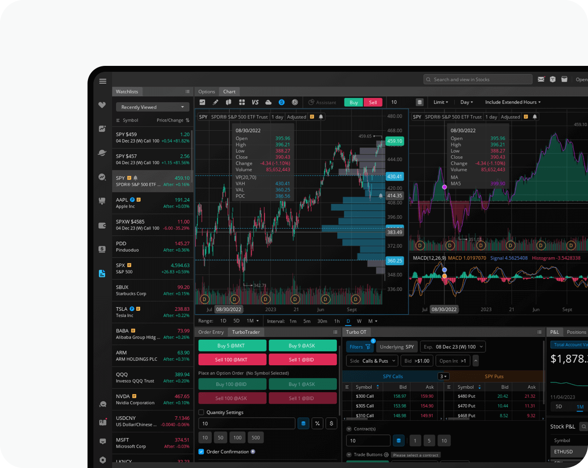 Execute your strategy with advanced order types like Stop, Stop Limit, Take Profit, and Good-Til-Cancelled (GTC) to manage your risk effectively.